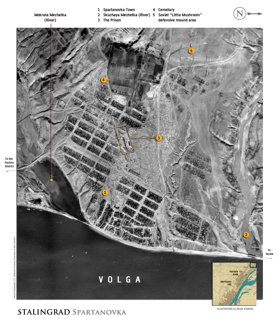 The Kommissarhaus is between rectangles 2 and 3. A post-Battle aerial photo of Barrikady factory shows the distinct shape of the Kommissarhaus.