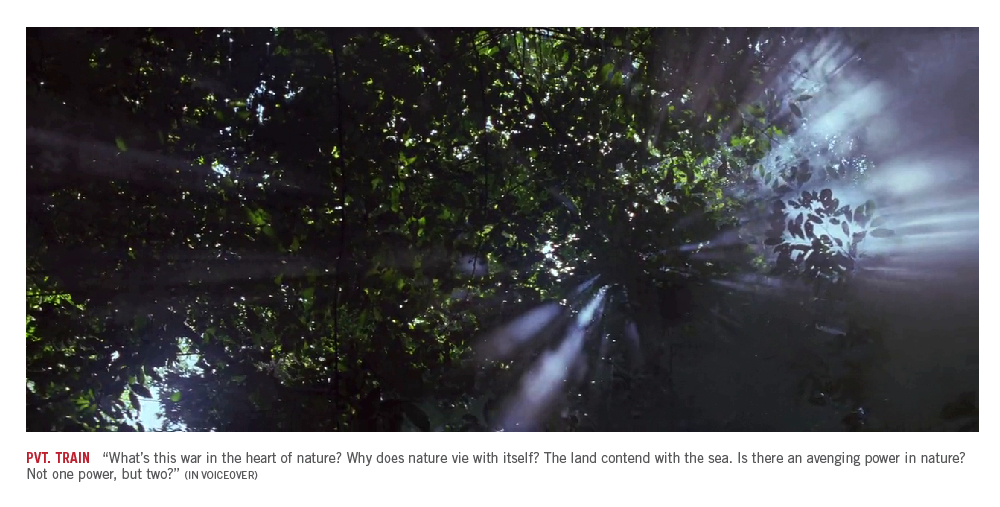 TRL - TrainIn the book, the bulk of the narrative deals with the men of C-for-Charlie Company and the battle for the fictional Hill 210 on the Pacific landmark that was Guadalcanal. With Malick’s lyrical prose, the battle for the hill takes an immense prominence but in the end it proves a mere background to the men who swarm over its grassy slopes. The story, helped by dialogue of incredible depth and cinematography of astounding beauty is bound together by the technique of the voice-over. Often spoken by a person who sounds like Witt, this is actually Private Train, a nervous, fearful farm boy who appears only at the beginning and at the end of the film.