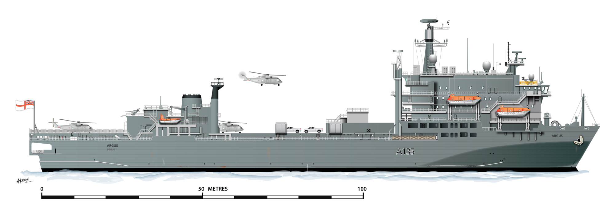 The name Argus is not exactly esoteric. In Homer’s Odyssey, Argus is Odysseus’ faithful dog who recognizes his master after twenty years and immediately dies of happiness. Then there is the World War II-era HMS Argus (the world’s first aircraft carrier).The new Argus is regarded as the “strangest ship” in the Royal Navy. It carries three Merlin helicopter. It also took on 32 Toyota Hilux pickup trucks for use in Sierra Leone, and with a 100-bed hospital with 200 doctors, nurses and medical staff.