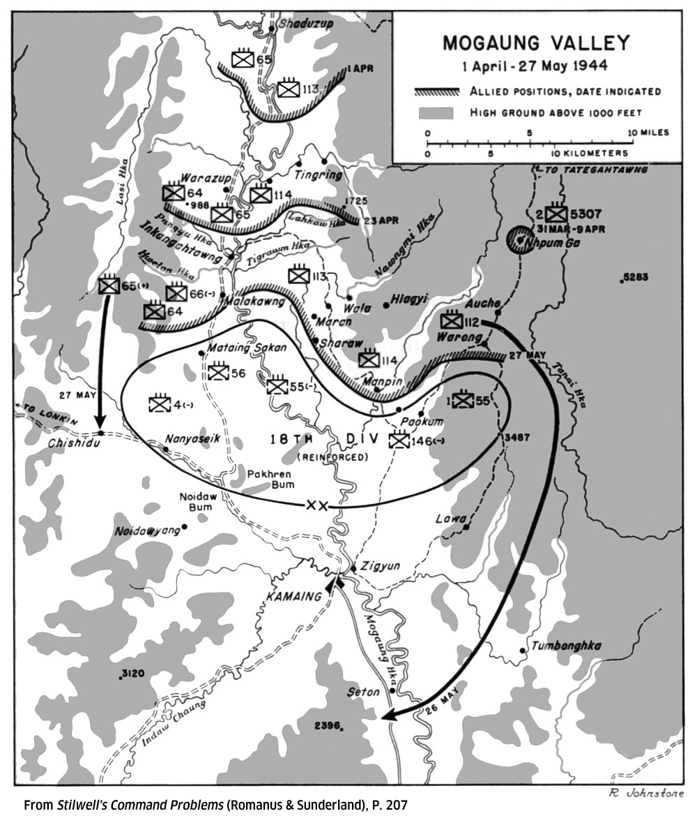 Lt-General Masaki Honda of the newly formed 33rd Army had been charged with defending Mogaung Valley, and he acted quickly. He ordered up Takeda’s 53rd Division from the south to reinforce the 18th Division at Kamaing, while he hurriedly shunted other forces to Mogaung.