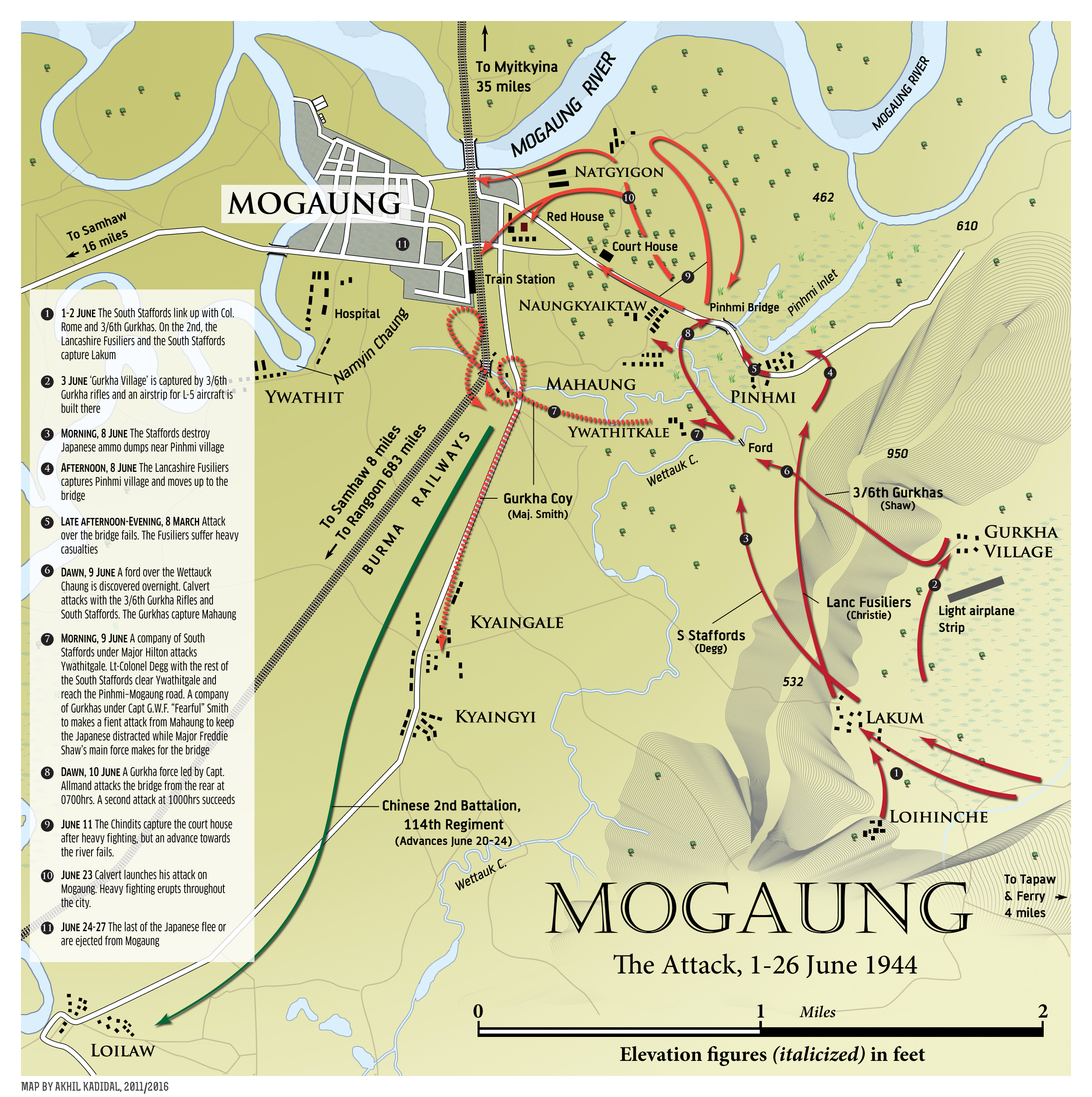 Meantime, Calvert’s 77th Brigade was down to 2,300 men of which only 550 were in fighting trim (including 230 Gurkha), owing to disease and wounds.[xliii] On June 2nd, they reached the foothills bordered Mogaung — now defended by a strong regiment from Lt-General Takeda’s 53rd Division. Nevertheless, Calvert’s troops had gone into the attack, in pouring rain, without tank, air or artillery support.