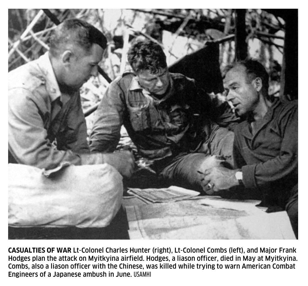 More bad news piled on to the disasters overtaking the brigade. Metcalf’s 21 Column, working their around Indaw from the south, had taken a beating. Initially, the column had done well. They discovered a massive supply dump at the “West” airfield and had called in an Air Commando airstrike. Column commanders believed the airstrike had been ineffective as they could not see the damage, but the Air Commandos had destroyed the dump wiping out critical supplies destined for the Japanese 18th Division.[xxxi] The column next ambushed a Japanese convoy, destroying about 30 Japanese trucks headed for Indaw.
