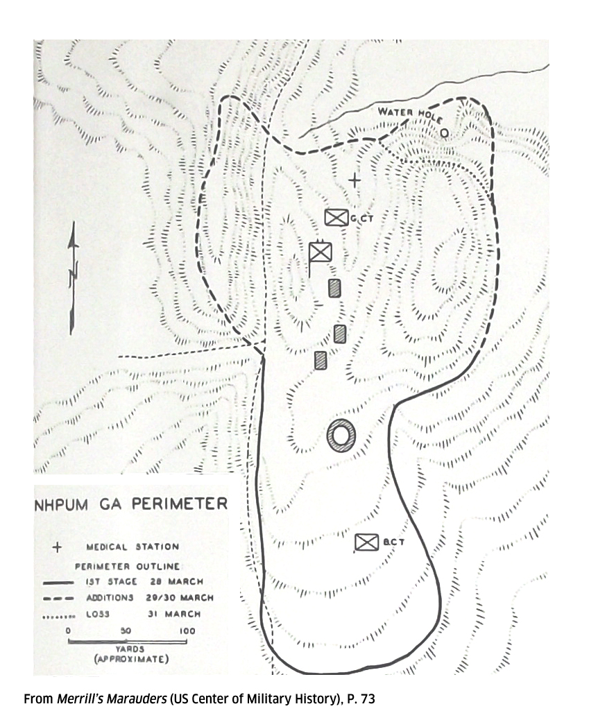 The Leicestershires came off down the ridge and taking the Japanese by total surprise, seized Inwa without casualties. Wilkinson and his men dug-in on the Inwa Chaung, a stone’s throw from the East Airfield, and secured their water source. They would hold the village for the next two days against overwhelming odds,[xxix] nimbly backed by the Air Commandos, who bombed, strafed and killed large numbers of Japanese. On the left flank, however, the picture turned grim.