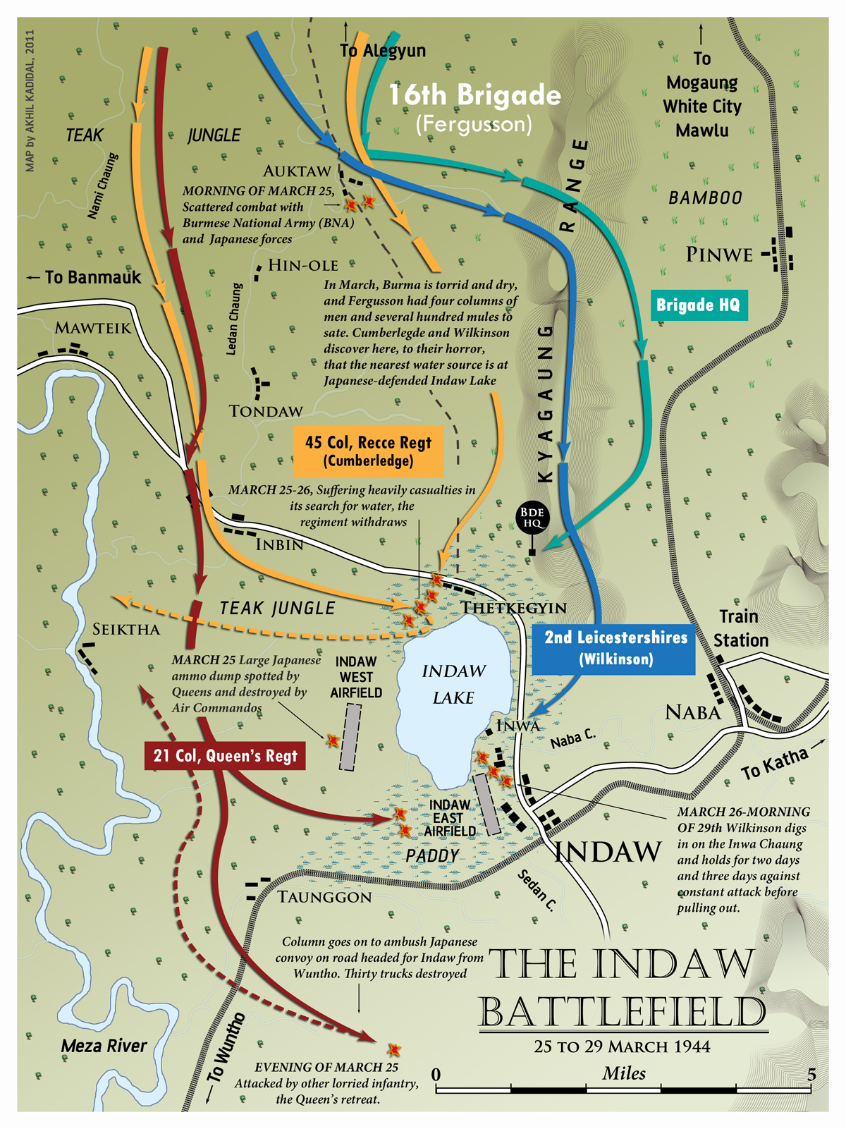 The 12th Nigerians were to garrison Aberdeen as the 16th Brigade departed for Indaw. However, none of the 900 men Fergusson had sent to Lonkin had returned, although they had routed the 300 Japanese from that town — earning a rare letter of congratulations from Stilwell. Consequently, Fergusson only had three exhausted battalions (the Leicestershires, the Queens and the 45th Recce) with which to attack Indaw, a mere 25 miles southeast, but for his weary troops, an eternity away.