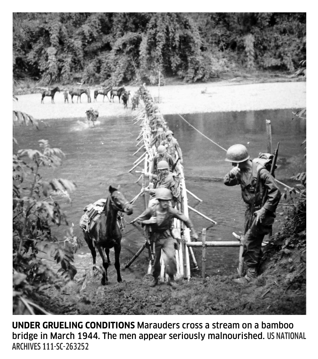 The column began to move east towards the Meza River to find water, relentlessly harried by the Japanese. At the river, they ran into more Japanese. The thirsty mules, smelling the water, broke from their handlers and charged towards river and straight towards Japanese lines. Seeing them, an animalistic instinct appeared to overtake some of the troops as well. They rushed blindly towards the river, caring nothing for death if it only meant slaking their thirst. Many were killed.