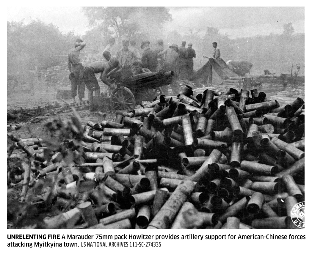 By the afternoon of the 19th, Takemura’s forces were in Indaw. In the days before “U-Go,” the city had been quiet, a backwater. Now, it been turned into a supply dump for the Japanese 33rd Division fighting in India, containing 28 days’ worth of rations for the divisional troops, 10 days’ supply of ammunition, 4,500 mortar bombs for the 15th and 31st Divisions, 4,000-6,000 cannon rounds, mountains of rifle ammunition and other military supplies.[xvii]