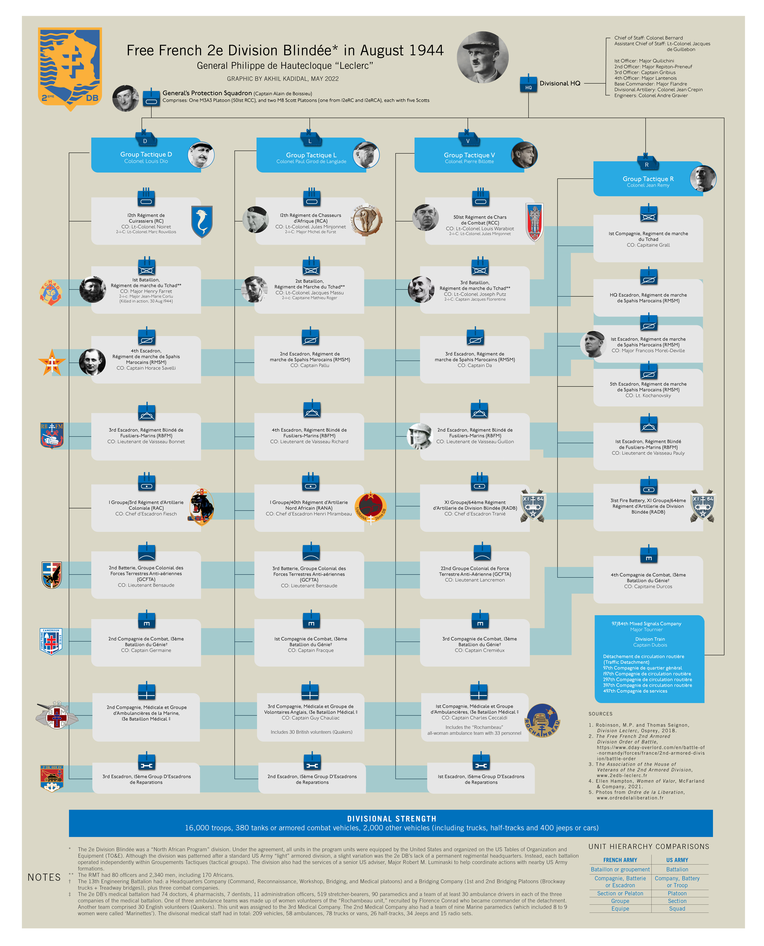 Although modeled around a US Army “light” armored division, the 2e DB differed in that it did not have a permanent regimental headquarters. Each battalion operated independently within Groupements Tactiques (‘GTs’ or Tactical Groups). A US Army liaison officer, Major Robert M Luminaski, was attached to the division. (Vigneras, 295)