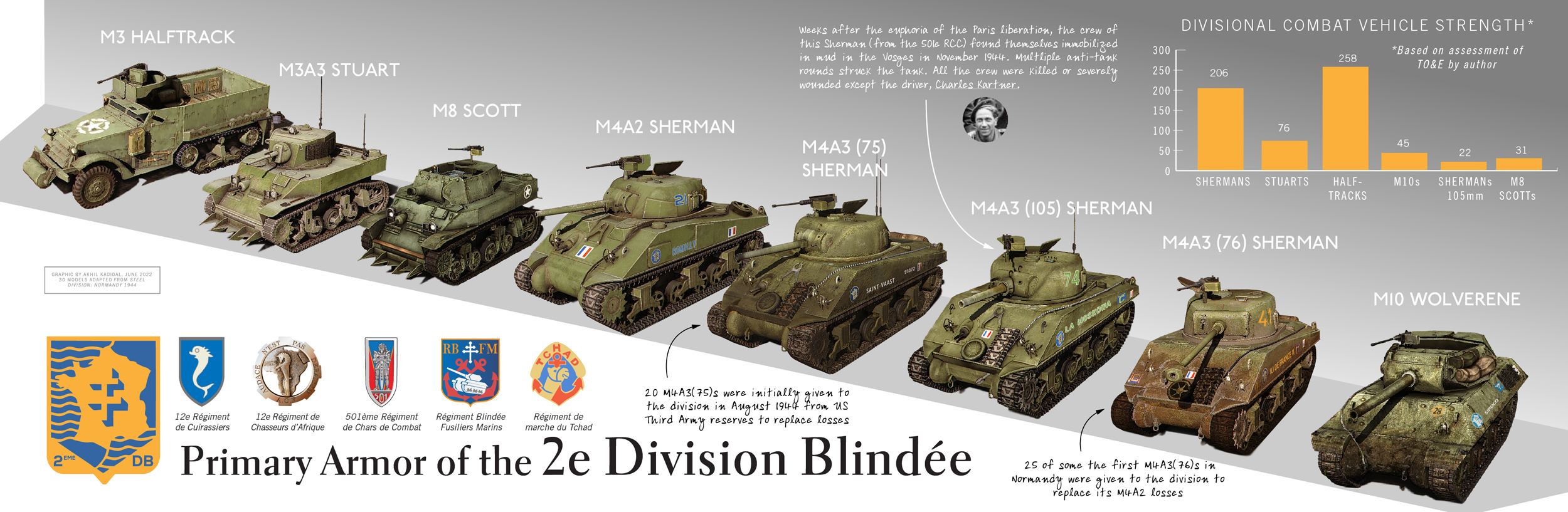 Note: Remarkably, by June 1944, the entire Free French Army had only been issued with 368 M4A2 and 268 M4A4 medium tanks, and 273 M3A3 and 230 M5A1 Stuart light tanks. These 1,139 tanks also included replacement tanks and collectively were distributed among the three Free French armored divisions in existence, five infantry division reconnaissance battalions, and two non-divisional reconnaissance battalions. (Vigneras, Rearming the French, 245). So, the 2e DB alone accounted for 26.6% of these vehicles.