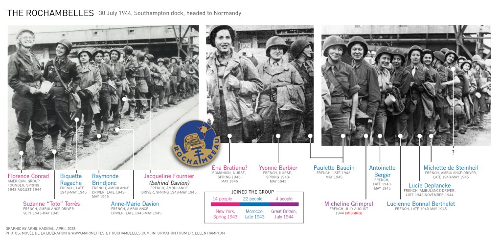 As historian Ellen Hampton said, the name “Rochambeau” was intended to be recognizable to Americans. Conrad recruited 13 women in New York in 1943 (although four would leave in North Africa). Conrad also purchased 19 Dodge WC-54 ambulances. Another 22 French women were recruited in Morocco. The unit’s integration into the 2e DB was negotiated between Leclerc and Conrad in October 1943. In England, four more women joined the group. Eight-seven percent of the total group were French.