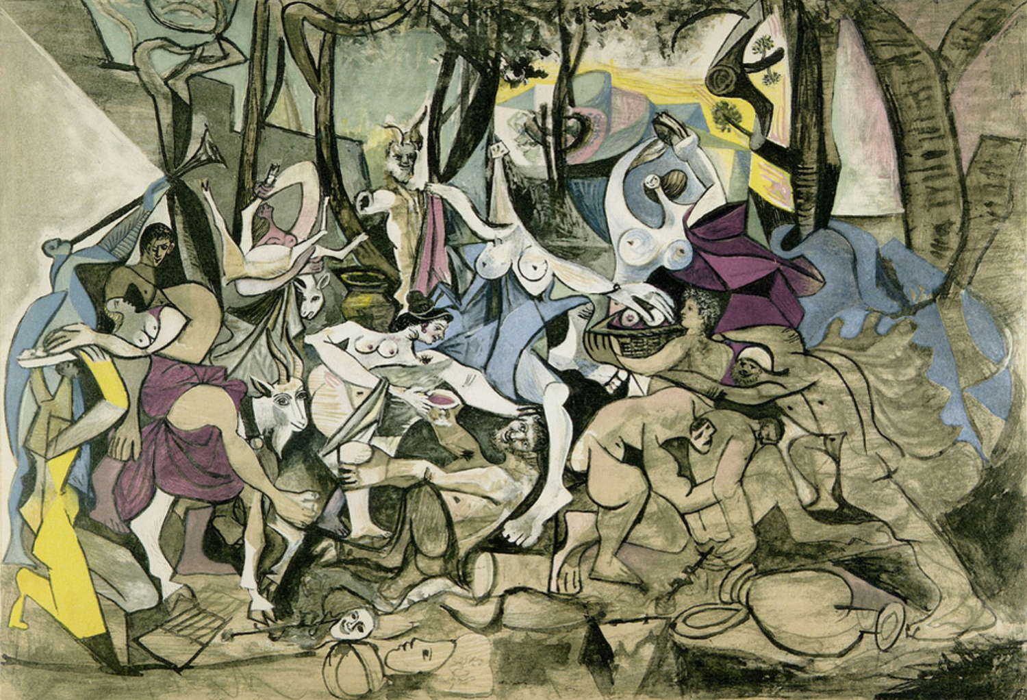 Subconsciously perhaps, the colors of the French tricolor began to appear in the painting, reflected in the clothes of the subjects. In Picasso’s version, the vision of a man helping an inebriated Pan to his feet at the left of Poussin’s drawing was moved to the right of the piece and appears to be a man helping a wounded figure, as a helmeted figure stands above them, shielding them. (Cobb, 262)