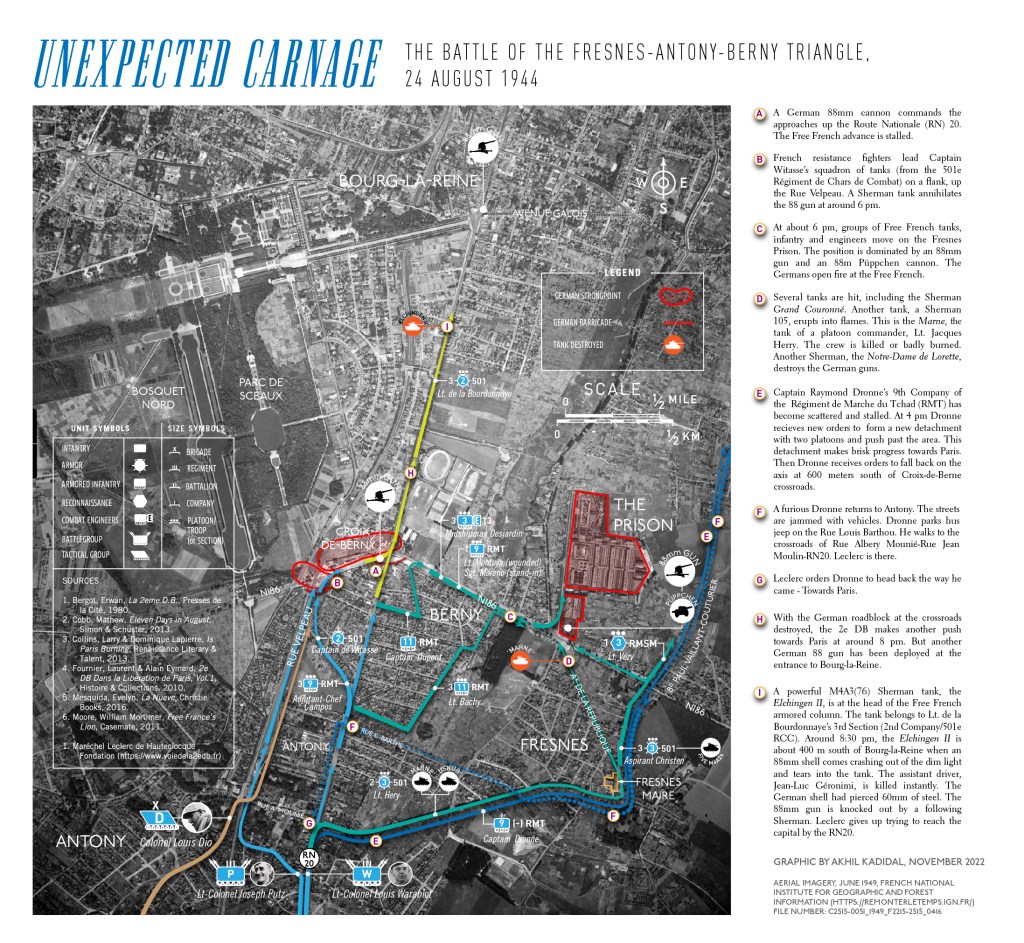 Leclerc ordered Tactical Group ‘D,’ commanded by Colonel Louis Dio, to reinforce Billotte. German resistance at Antony collapsed at 4 pm. But further attempts at advance were stymied by shortages of fuel. At about 7 pm, Billotte halted his advance.