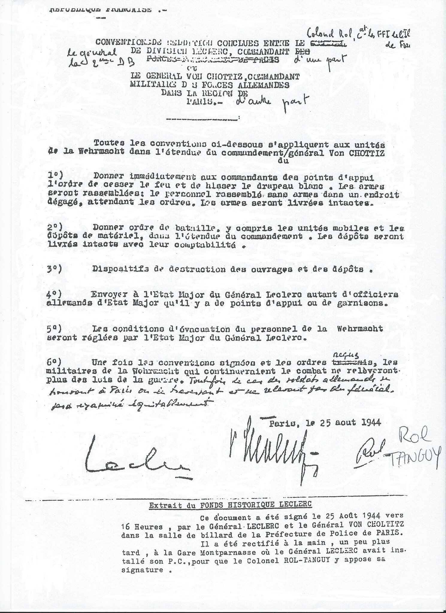 Act of Surrender concluded between the Divisional General Leclerc, commanding the French Forces of Paris and General von Choltitz, Military Commander of the German Forces in the Paris Region.