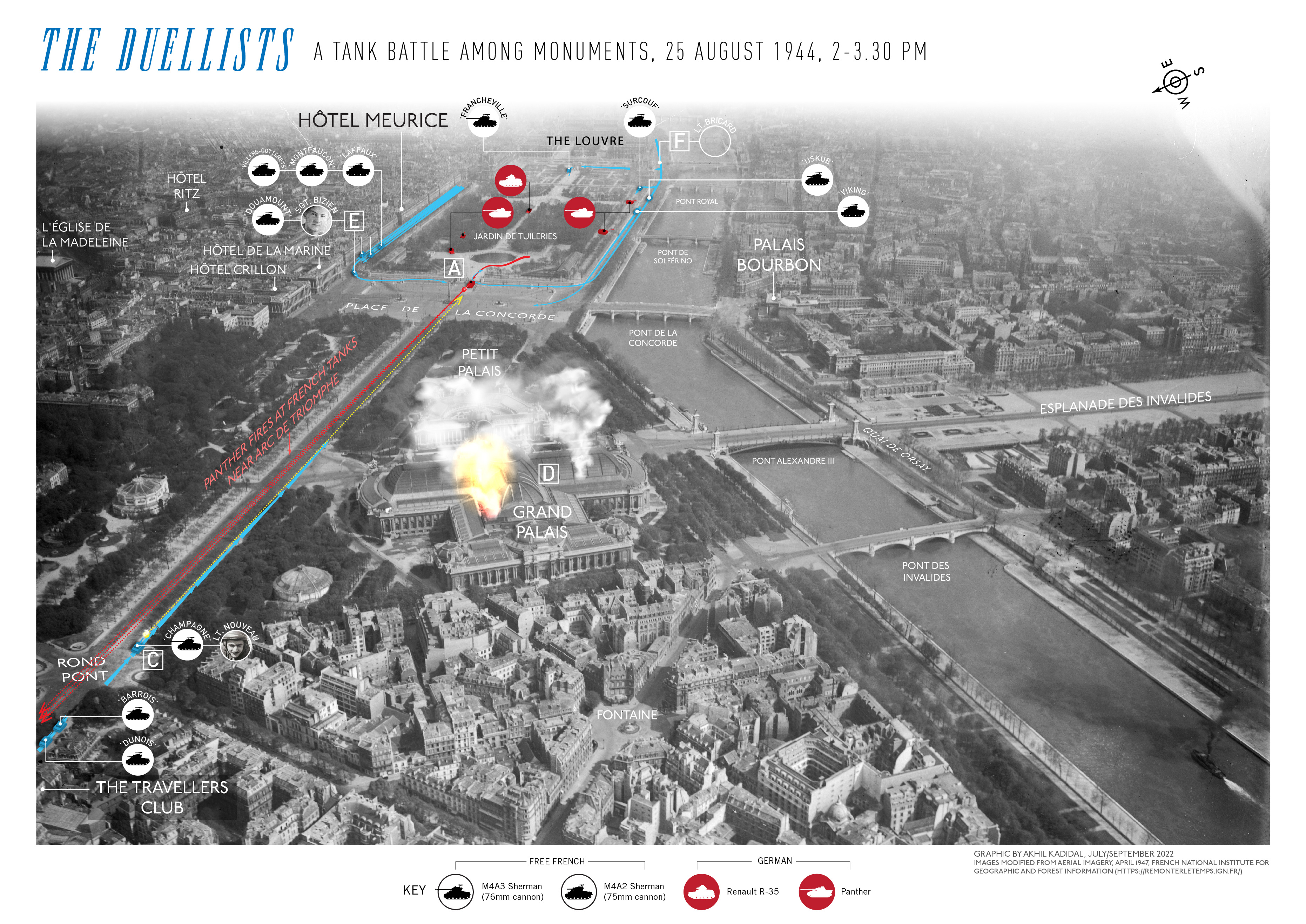 Choltitz began dictating a last letter to his confidant of the last few days, Raoul Nordling. He observed a Sherman gracefully swinging its cannon at the hotel. The head of the tank commander, wearing a black beret, bobbed in the open hatch.