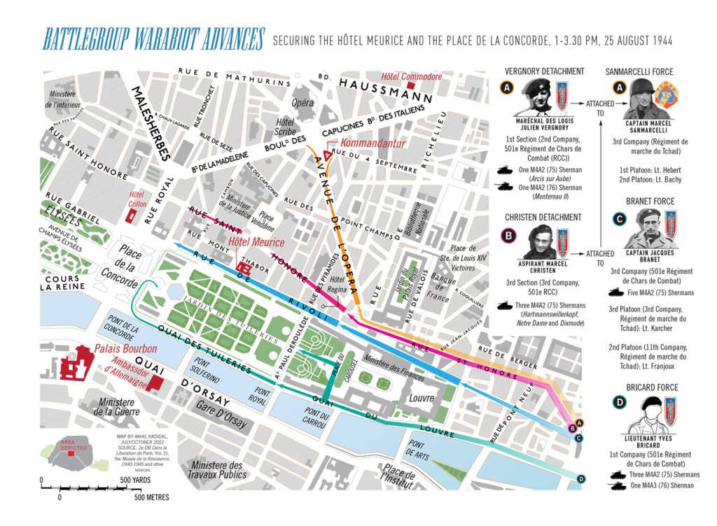 A fourth force of five Sherman tanks under Lt. Bricard of the 1st Company, 501e RCC plus two platoons of infantry from the 3rd Company (RMT) were to destroy German forces in the Jardin des Tuileries and along the north bank of the Seine. Bricard and Branet’s orders also included securing the Place de la Concorde.