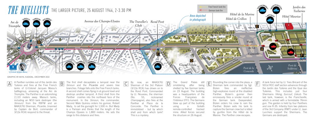 Meanwhile, three Sherman tanks of Aspirant Marcel Christsen’s 3rd Platoon (of 3/501e RCC) were to secure the rue du Faubourg Saint-Honoré behind the hotel.