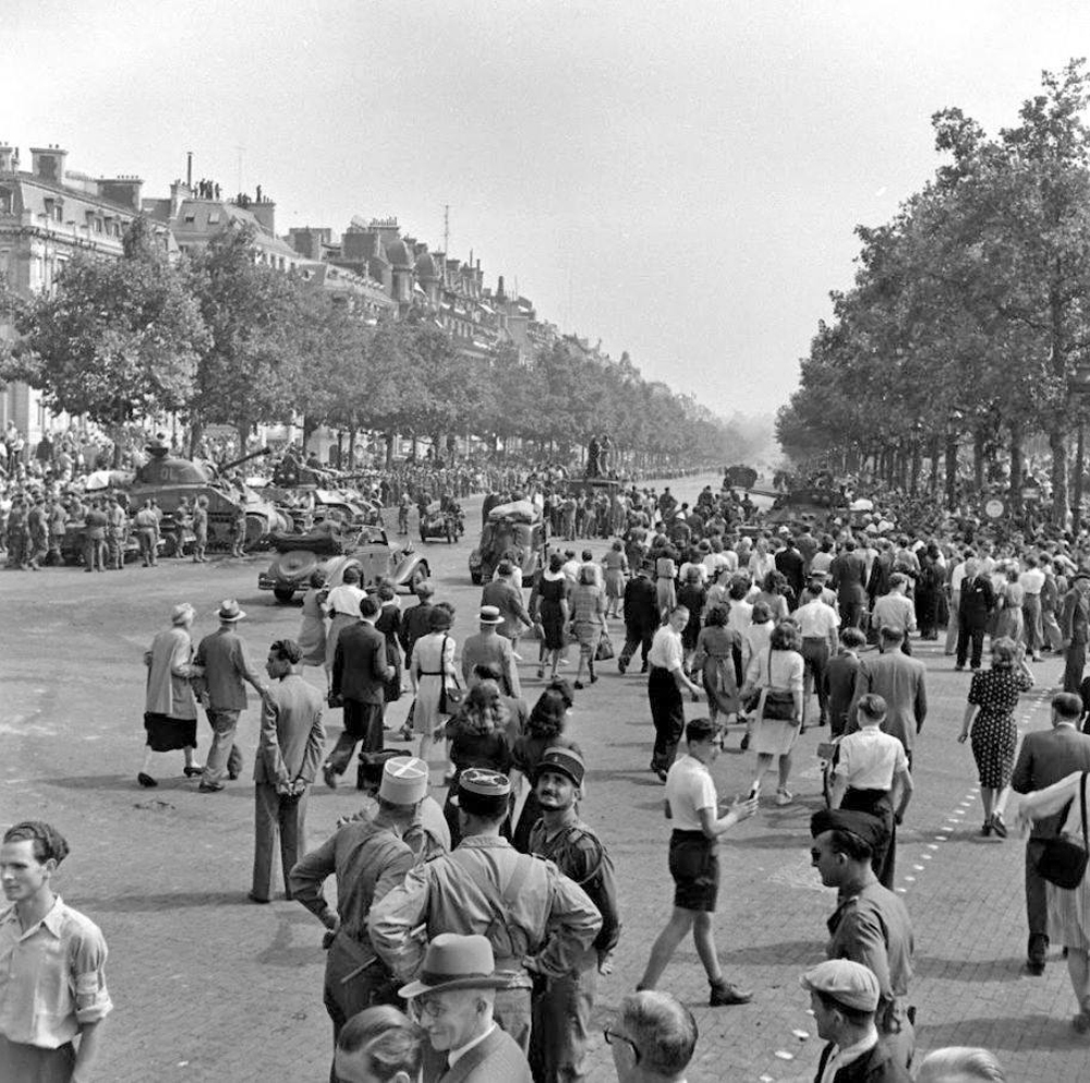 De Gaulle saluted the company in recognition of their feat in entering the city first before all else. (Mesquida, loc. 2482, 52%). The company halftracks stood among 50 parked in a line across the width of the place de l’Etoile, facing down the Champs-Elysées. The tanks of Langlade’s Tactical Group were lined down the Champs Élysées.