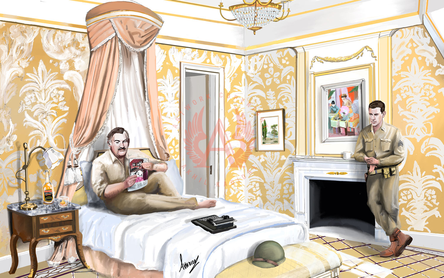 Hemingway and his band went up on the roof and for a moment, Beach could hire gunfire. Shortly after, Hemingway came down, bid Beach farewell and raced off northwards again with his men to “liberate the cellar at the Ritz.” He entered the hotel through the Rue Cambon entrance with shouts of “Raus” as if he expected a platoon of Germans to be waiting for him.