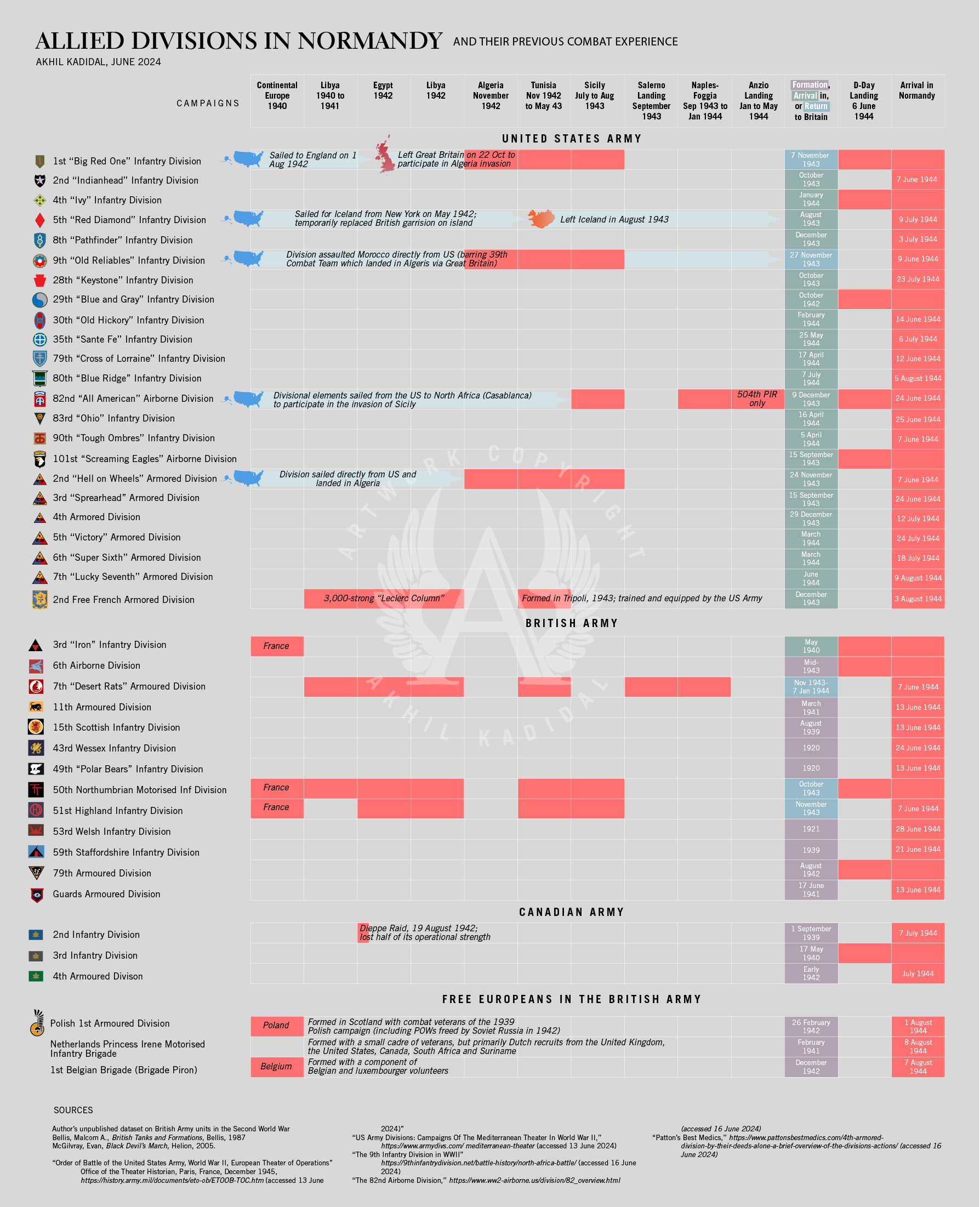 In reality, Eisenhower had 38 divisions (22 infantry, four airborne and 12 armored). He also had 16 separate US Army tank battalions, seven independent British armoured brigades, two independent British infantry brigades, and two British Special Forces/Commando brigades which saw action in Normandy.