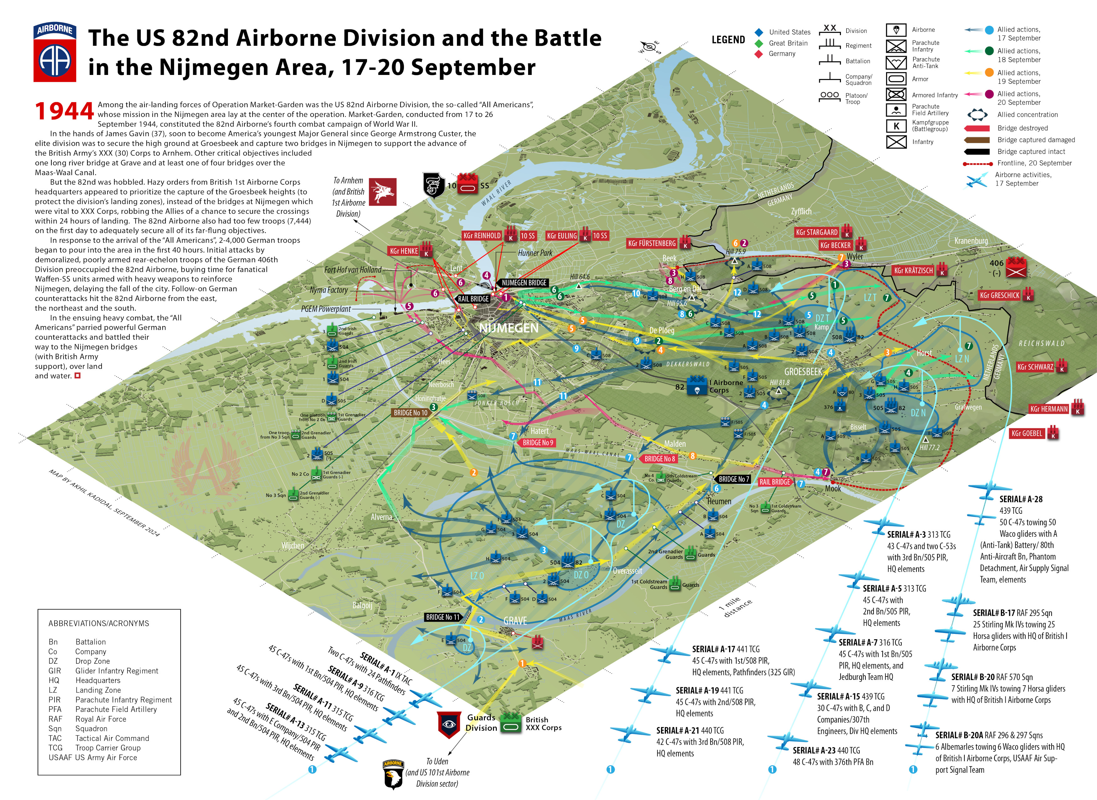 The 504th PIR had the task of secure at least one of the four canal bridges and the key bridge at Grave town. The 505th PIR landed around Groesbeek. The 508th PIR would drop north of Groesbeek at 1328 hrs. A post-action divisional history would record that the “drop patterns were excellent.” (A Graphic History of the 82nd Airborne Division (US Army/SHAEF, 1945), pg. 4)