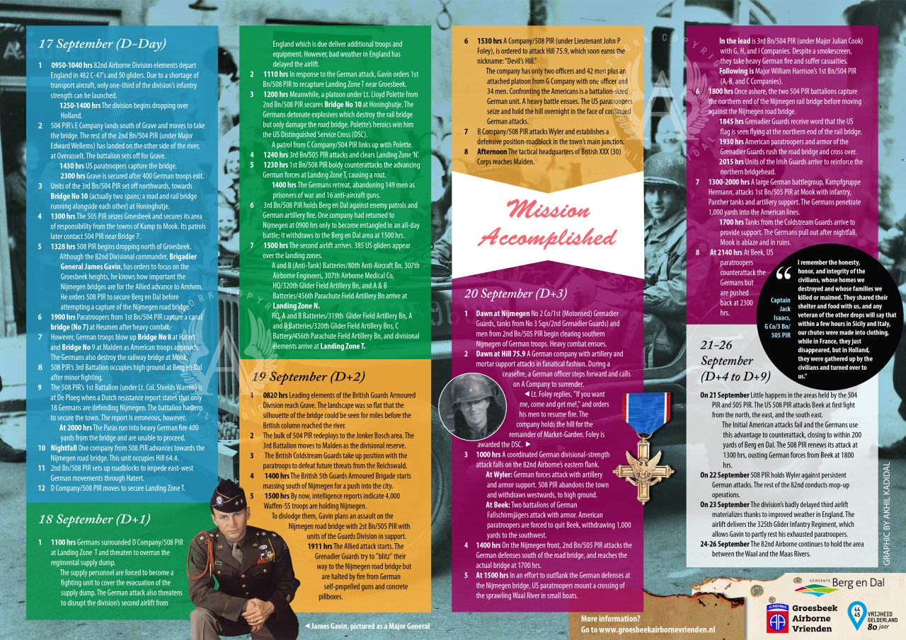 While Gavin did not push back against this, he separately told Colonel Roy Lindquist, commander of the 508th Parachute Infantry Regiment (PIR), that although the regiment’s primary mission was to hold the high ground at Berg en Dal near Groesbeek, he was also to send his 1st Battalion into Nijmegen to take the road bridge.